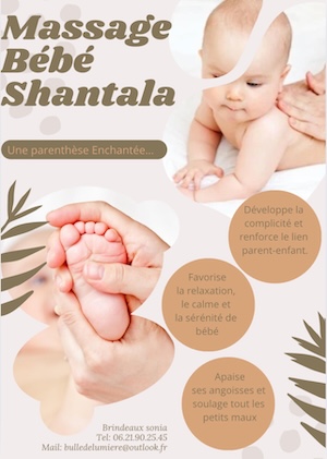 Sonia BRINDEAUX : formée et certifiée en massage bébé shantala (formations aux arts des massages du monde), je propose des ateliers de massage pour apprendre aux parents à masser leur bébé. Je peux me déplacer à votre domicile avec le matériel adapté : huile, serviettes, musiques…